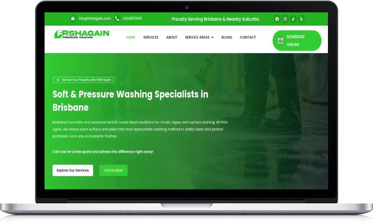 FrshAgain is a professional pressure washing website built for the Australian market, designed with a high-converting layout focused on lead generation and customer engagement.